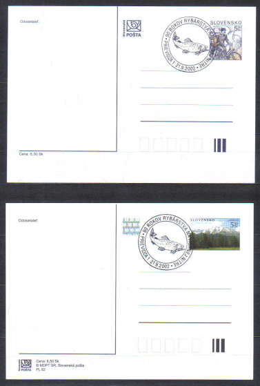 Slovensko 2 typy korešpondenčneho listu s pamatnym razitkom - 90 rokov rybarstva Prievidza 2002 .
