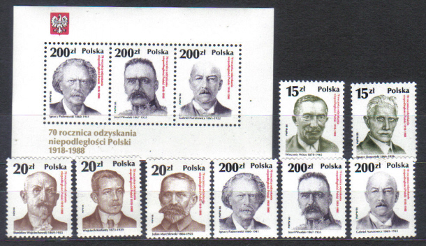 Polsko čista kompletna seria + aršik - politici 1988.